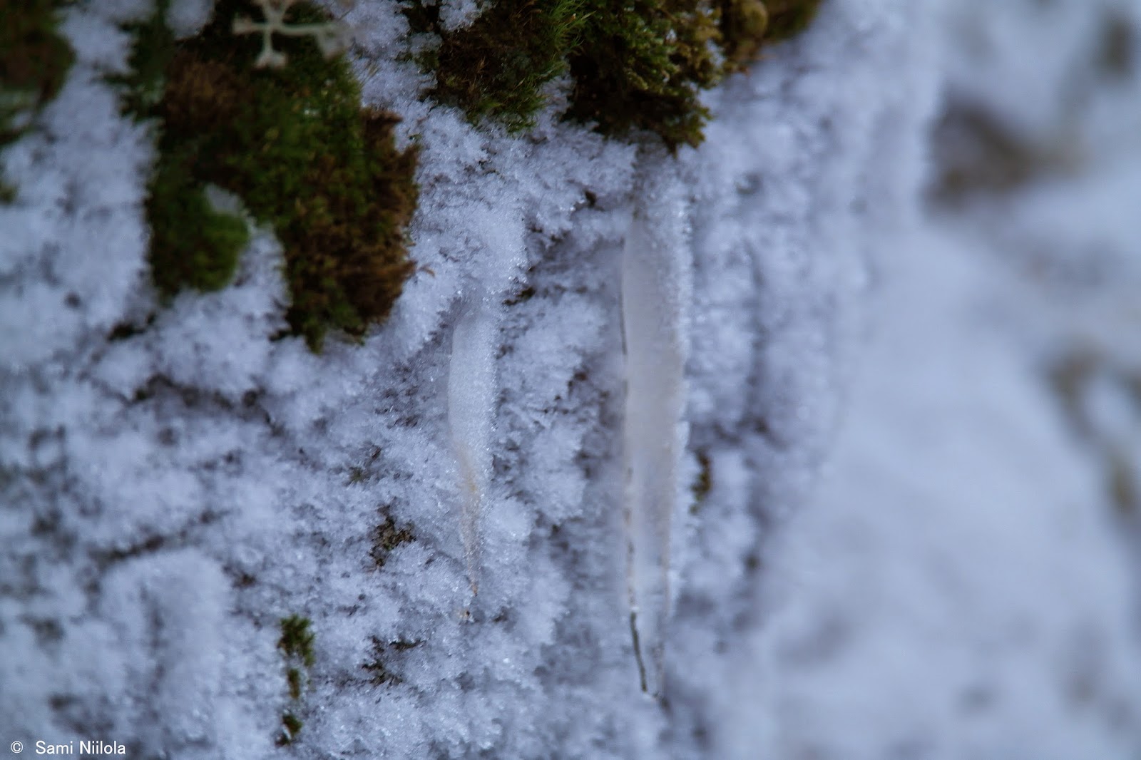 Vesisateen jälkeen tullut pakkanen, on muodostanut kiven reunalle jääpuikkoja.